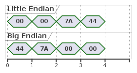 本參數用來調整 RX (流量計回傳資料) 時每個多 byte 資料的內部 byte 傳輸順序。modbus ID、指令、CRC及單 byte 資料不受影響。 例如要傳回傳流量及流速資料假設流量的數據是1000,回傳時,仍會先傳流量再傳流速,但是用來表達1000的這4個 byte 的傳輸順序不同,1000表示為16進制是 00007A44,以下是兩個不同格式時的順序。(下圖每個菱形圖示是一個 byte。)
