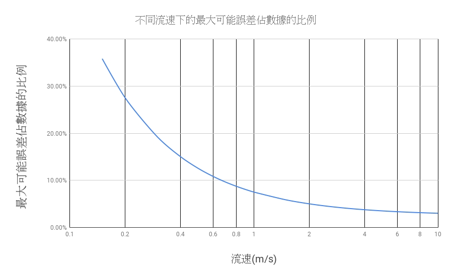 本流量計的最大可能誤差為 0.5 % F.S. + 2.5 % O.R.,換算為在不同流速下最大可能誤差與顯示數據的關係如下圖: