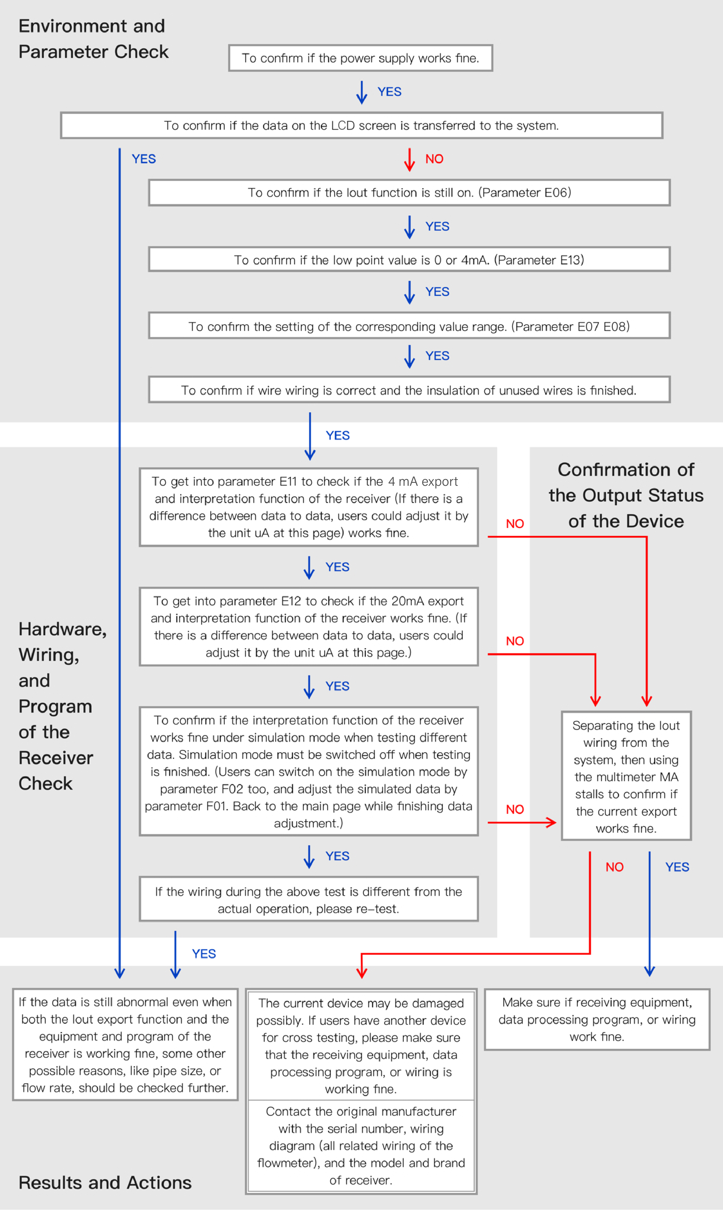 If the data is still abnormal when both the Iout export function and the equipment and program of receiver work fine, some other possible reason, like pipe size, or paddle wheel abnormal, should be checked further.