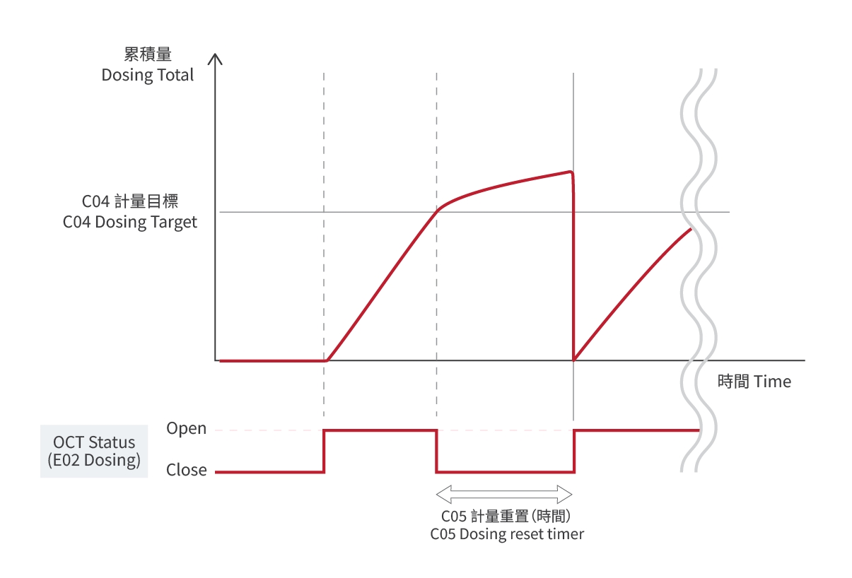 開始添加: 返回主畫面,當添加量達到目標值時,OCT 的狀態會從短路變為導通。 主畫面將開始倒數計時,最上一行中間會顯示剩餘時間。 在倒數計時結束前,如果有流量通過,dosing 畫面上的累積量會持續更新。