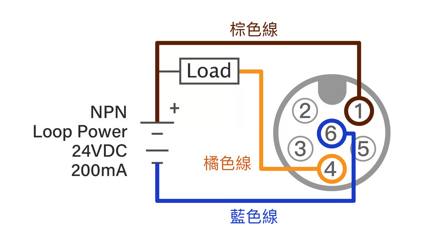 棕色線：24 VDC (+)、藍色線：0 VDC (-)、橘色線：NPN 輸出 (+)
