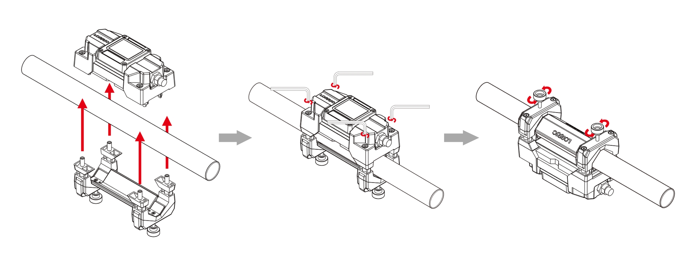主機面向預定操作方向後,將主機及扣具以螺絲預固定在管路兩側,此時如果是適用管路中偏大的管路,可能主機已不會移動。如果是適用管路中偏小的管路,主機還在可動狀態,請固定好流量計。