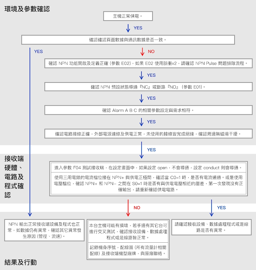 NPN輸出正常接收端設備及程式也正常,如數據仍有異常,確認其它異常發生原因 (管徑、流速)。