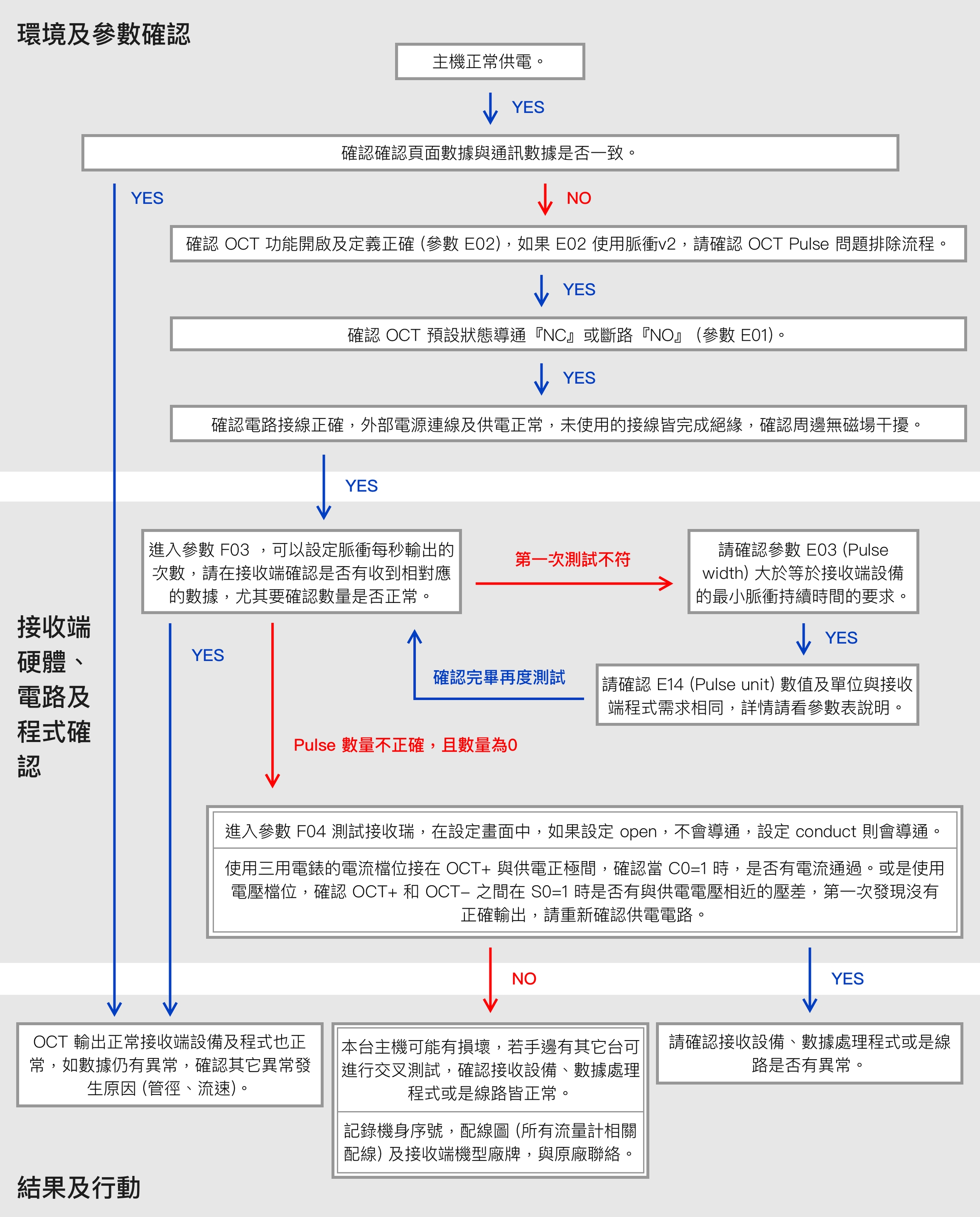 OCT 輸出正常接收端設備及程式也正常,如數據仍有異常,確認其它異常發生原因(管徑、流速)。