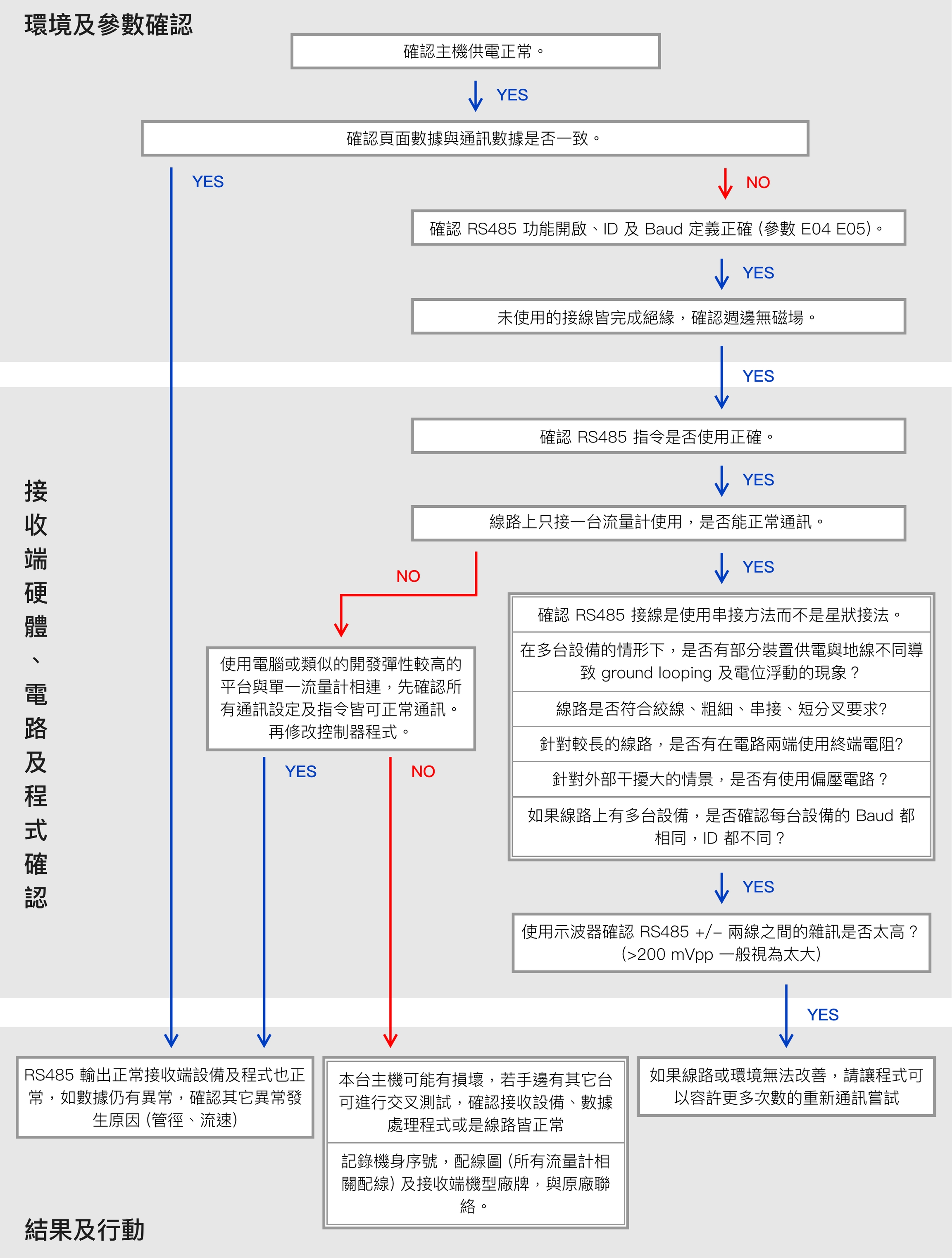 RS485 輸出正常接收端設備及程式也正常,如數據仍有異常,確認其它異常發生原因 (管徑、流速)。