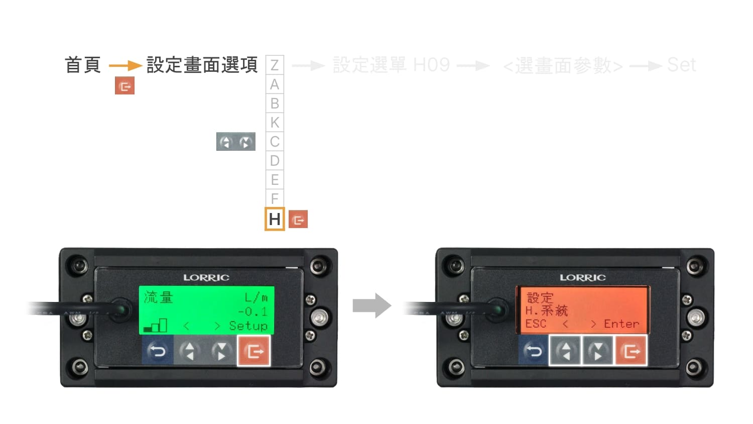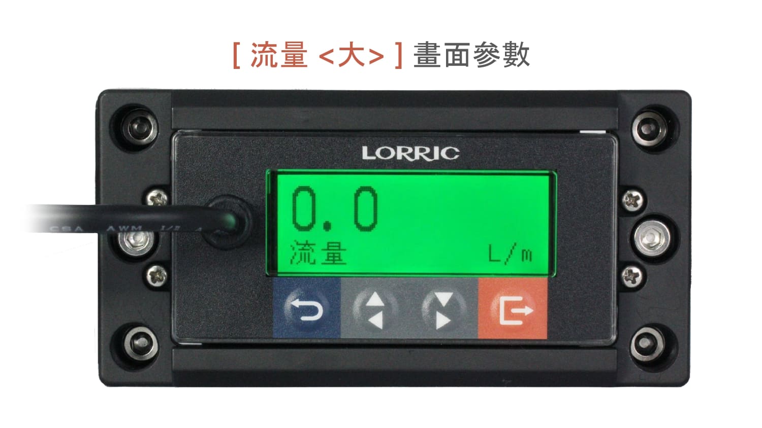LCD 螢幕顯示大數字為瞬時流量,底部右下顯示流速單位 L/m,在此頁面,按下右下橘鍵後也會進入設定頁面。