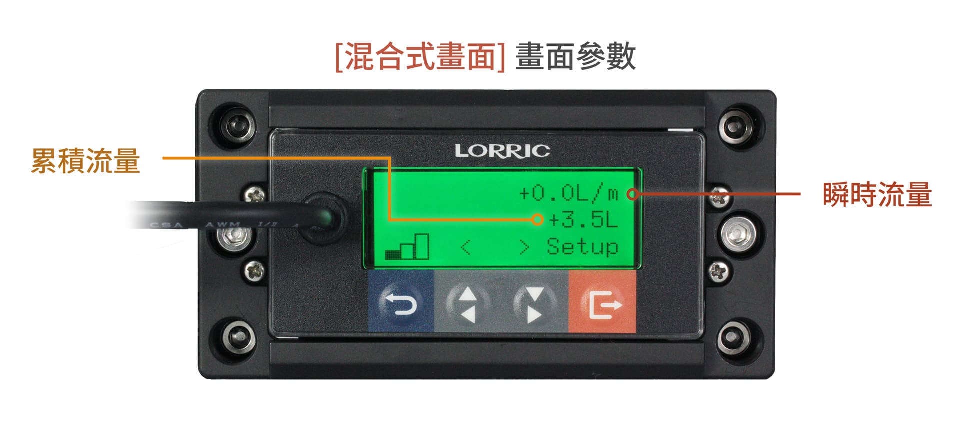 LCD第一行顯示 "瞬時流量" ,第二行顯示"累積流量",第三行左下顯示流量訊號,右下顯示Setup,表示按下橘鍵後會進入設定頁面。