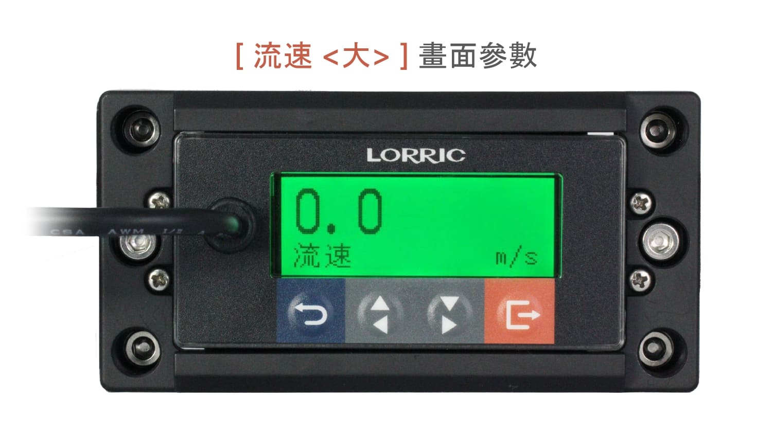 LCD 螢幕顯示大數字為流速,底部右下顯示流速單位 m/s,在此頁面,按下右下橘鍵後也會進入設定頁面。