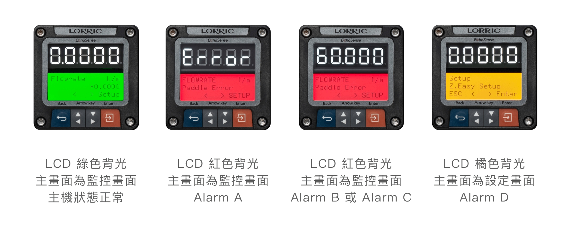 持續紅色:Alarm B 主機滿足使用者指定的條件,需注意。Alarm C 為流量計需維護。