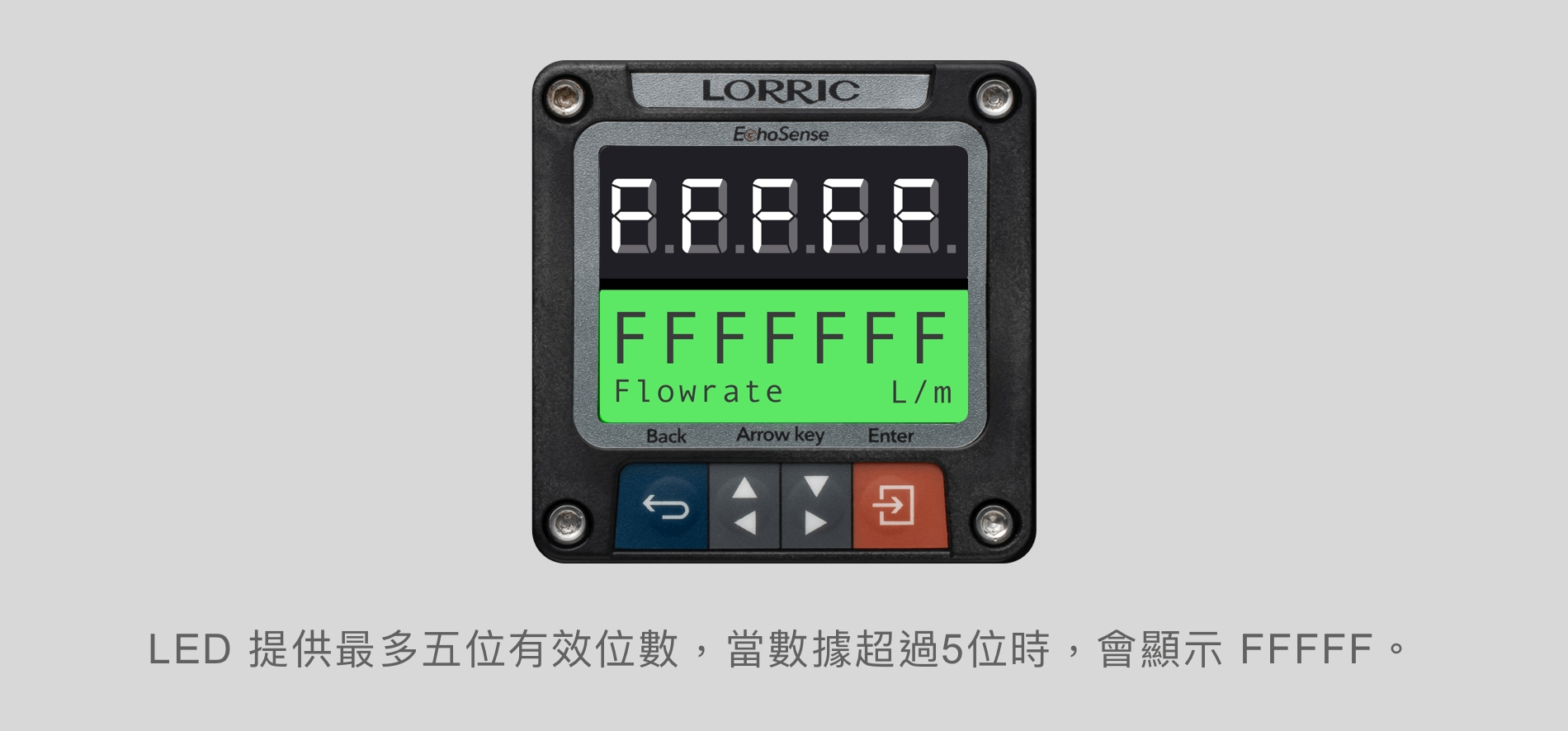 LED 提供最多五位有效位數,當數據超過5位時,會顯示 FFFFF (如下圖) ,這時可以通過更改單位或是直接看 LCD 第二行的數據來了解流量。